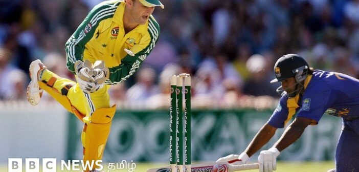 இலங்கை வீரர்கள் அதிர்ச்சியில் உறைந்திருக்க, கில்கிறிஸ்ட் பெவிலியன் நோக்கி நடக்கத் தொடங்கிவிடுவார்.