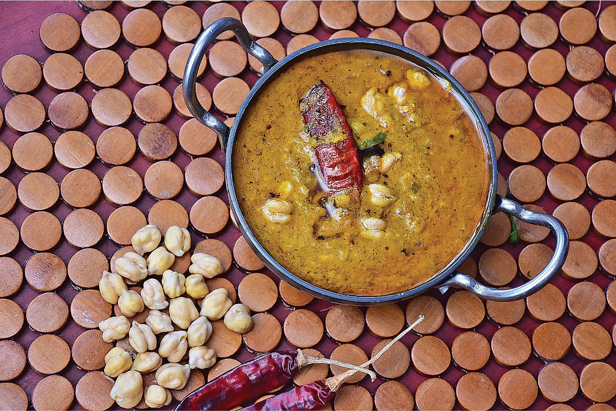 வறுத்து அரைக்கக் கொடுத்துள்ளவற்றை சிறிதளவு எண்ணெய்விட்டு வறுத்து பொடியாக அரைக்கவும். கொண்டைக்கடலையை நீரில் ஐந்து மணி நேரம் ஊறவைக்கவும். குக்கரில் நீர்விட்டு கொண்டைக்கடலையுடன் உப்பு சேர்த்து இரண்டு விசில் வரும் வரை வேகவிட்டு எடுத்துக்கொள்ளவும். புளியைக் கரைத்துக்கொள்ளவும். வாணலியில் எண்ணெய்விட்டு சூடானதும் தாளிக்கும் பொருள்களைத் தாளித்து, கத்திரிக்காயைச் சேர்த்து வதக்கவும். புளிக்கரைசலை ஊற்றி உப்பு, மஞ்சள்தூள் சேர்த்து ஒரு கொதி வந்ததும் வேக வைத்த கொண்டைக்கடலையைப் போட்டு, அரைத்த பொடி சேர்த்து நன்கு வெந்ததும் கொத்த மல்லித்தழை தூவி அடுப்பை நிறுத்தவும்.