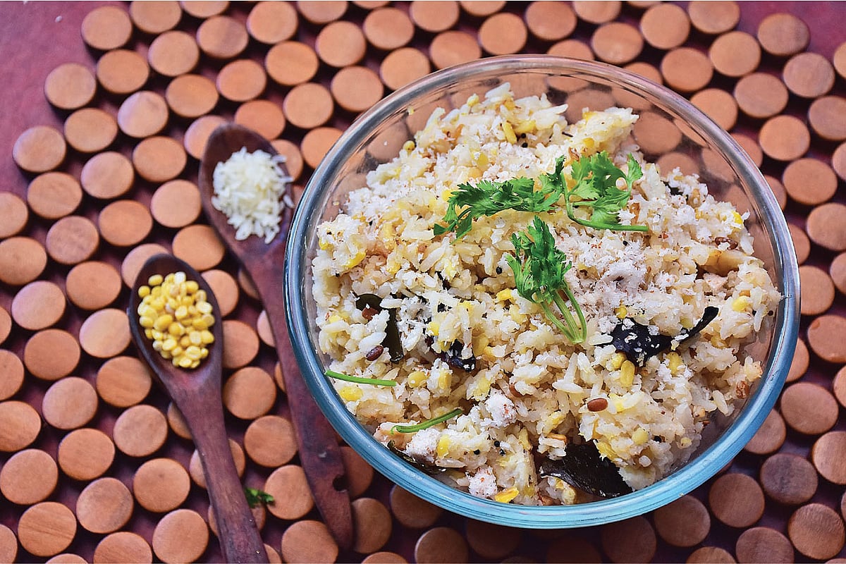 வாணலியை அடுப்பில் மிதமான தீயில் வைத்து சூடானதும் அரிசியையும் பாசிப்பருப்பையும் தனித்தனியாகச் சிவக்க வறுத்து எடுத்துக்கொள்ளவும். குக்கரில் எண்ணெய்விட்டு சூடானதும் தாளிக்க வேண்டிய பொருள்களைப் போட்டு தாளித்து இரண்டு கப் நீர் விட்டு உப்பு, கரம் மசாலாத்தூள், எள்ளுப் பொடி சேர்க்கவும். ஒரு கொதி வந்ததும் தேங்காய்த் துருவல் சேர்த்து, சதுரமாக நறுக்கிய உருளைக்கிழங்கு, வறுத்த அரிசி, பாசிப்பருப்பு சேர்த்துக் கிளறி மூடி இரண்டு விசில்விட்டு இறக்கவும். குக்கரில் பிரஷர் அடங்கியதும் திறந்து வேர்க்கடலைப் பொடி, கொத்தமல்லித்தழை தூவிக் கிளறி பரிமாறவும்.