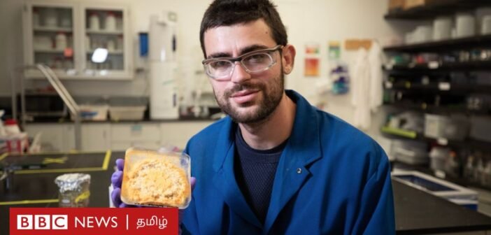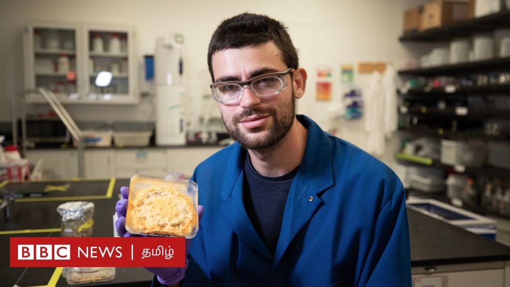 படக்குறிப்பு, தக்காளி கழிவில் வளர்க்கப்படும் நியூரோஸ்போரா பூஞ்சை. ரொட்டி மீது செடார் சீஸ் சேர்த்து டோஸ்ட் செய்யப்பட்ட சுவை மணத்தைத் தரும்