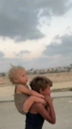 காஸாவில் கட்டாய இடப்பெயர்வின் குழப்பம் மற்றும் பயங்கரமான சூழ்நிலைக்கு மத்தியில், காலணி அணியாத ஒரு சிறுவன், தனது தம்பியைச் சுமந்து கொண்டு, கண்ணீரில் குரல் அடைக்க “யா உம்மா” (அம்மா) என்று மீண்டும் மீண்டும் கத்திக் கொண்டு ஓடும் காட்சி உலக அளவில் கவனத்தை ஈர்த்துள்ளது.