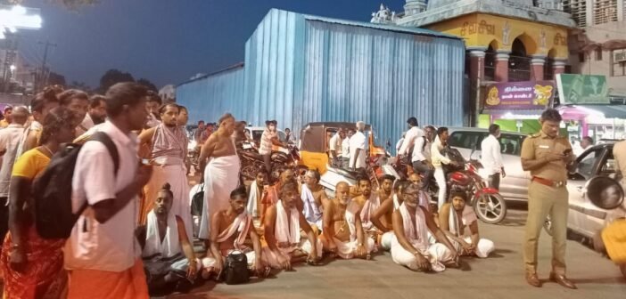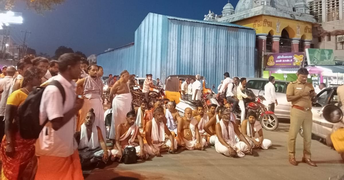 முன்னதாகவே, இந்த கைது நடவடிக்கை குறித்த தகவல் மற்ற தீட்சிதர்களுக்கும் தெரிந்ததால்… கோயில் வாயிலின் முன்பாக அமர்ந்து மறியல் போராட்டத்தில் ஈடுபட்டனர். அப்போது அவர்களை கலைக்க முற்பட்ட போலீஸாருக்கும், தீட்சிதர்களுக்கும் இடையே தள்ளுமுள்ளு ஏற்பட்டது. எனவே, சாலை மறியலில் ஈடுபட்ட தீட்சிதர்களை கைது செய்து திருமண மண்டபம் ஒன்றில் அடைத்த போலீஸார், பின்னர் விடுவித்தனர்.