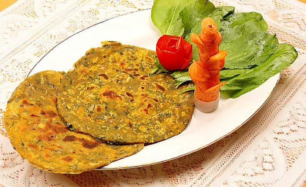 இஞ்சி, சீரகம், பச்சை மிளகாயை மிக்சியில் கரகரப்பாகப் பொடிக்கவும். கோதுமை மாவு, கடலை மாவு, கம்பு மாவு, அரிசி மாவு, கீரை, உப்பு, தயிர், சர்க்கரை, ஓமம், மிளகாய்த்தூள், அரைத்த பொடி சேர்த்து தேவையான அளவு தண்ணீர் சேர்த்து ரொட்டி மாவு பதத்துக்குப் பிசையவும். பிறகு சிறிது எண்ணெய் தடவி மூடி அரைமணி நேரம் வைக்கவும்.