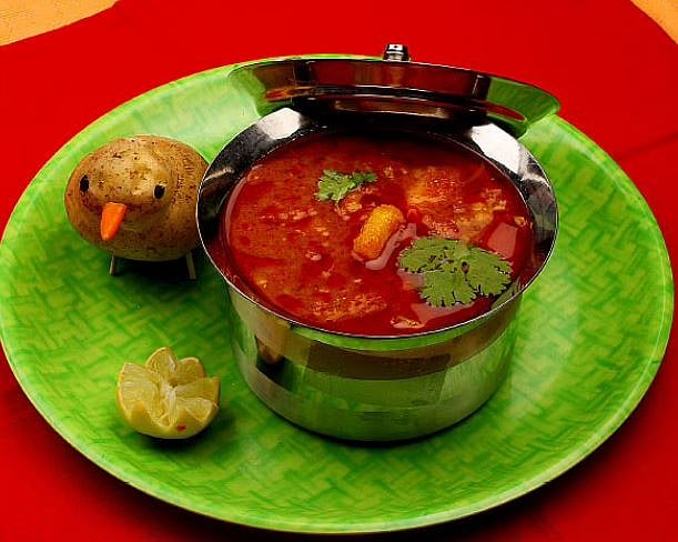 உருளைக்கிழங்கைக் கழுவி சதுரமாக நறுக்கவும். கடாயில் எண்ணெய்விட்டுக் காயவைத்து சீரகம் போட்டு வெடித்ததும் உருளைக்கிழங்கை போட்டு நன்றாக வதக்கவும். பிறகு மிளகாய்த்தூள், காஷ்மீரி மிளகாய்த்தூள், சீரகத்தூள், உப்பு, மஞ்சள்தூள் ஆகியவற்றை அரை கப் தண்ணீரில் கரைத்து, உருளைக்கிழங்குடன் சேர்த்து மூடி, சிறிது நேரம் வேக விடவும். குழம்பு பதம் வந்ததும் இறக்கவும். கொத்தமல்லி தூவி, பூரி அல்லது பரோட்டாவுடன் சூடாகப் பரிமாறவும்.