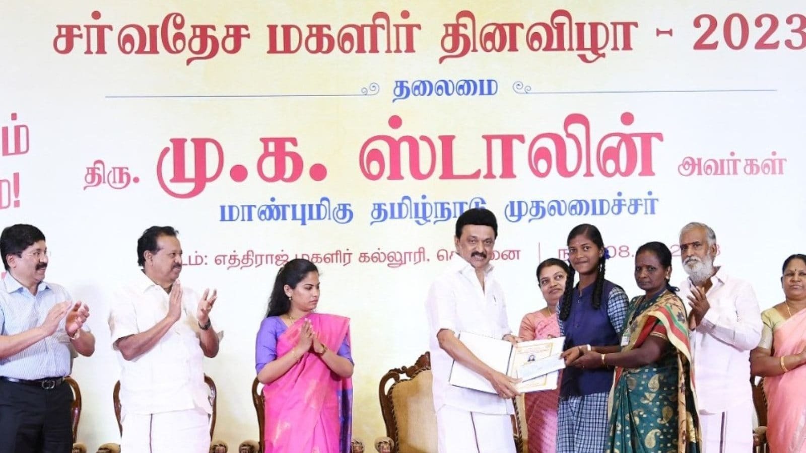 சென்னை எத்திராஜ் கல்லூரியில் நடைபெற்ற மகளிர் தின விழாவில் முதல்வர் மு.க.ஸ்டாலின் கலந்துகொண்டு பேசினார். அப்போது அவர், ‘இன்றைக்கு சட்டமன்ற உறுப்பினர்களாக, நாடாளுமன்ற உறுப்பினர்களாக, மேயர்களாக, அமைச்சர்களாக, அதிகாரிகளாக பெண்கள் எந்த அளவிற்கு வந்திருக்கிறார்கள் என்பதை எண்ணிப் பார்க்கின்ற நேரத்தில் இன்றைக்கு நாம் கொண்டாடிக் கொண்டிருக்கக்கூடிய இந்த மகளிர் தின விழாவை பூரிப்போடு கொண்டாடிக் கொண்டிருக்கிறோம்.