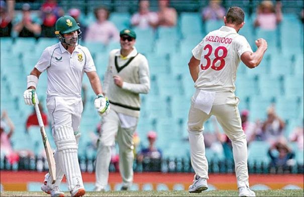 நேற்று 4-வது நாள் ஆட்டம் நடைபெற்ற நிலையில் ஆஸ்திரேலிய அணி மேற்கொண்டு பேட்டிங் செய்யாமல் முதல் இன்னிங்ஸை டிக்ளேர் செய்தது. இதைத் தொடர்ந்து பேட் செய்த தென் ஆப்பிரிக்க அணி சீரான இடைவெளியில் விக்கெட்களை இழந்தது. கேப்டன்டீன் எல்கர் 15 ரன்களில் ஜோஷ் ஹேசில்வுட் பந்தில் ஆட்டமிழந்தார். சரேல் எர்வீ 18 ரன்னில் நேதன் லயன் பந்தில் போல்டானார்.