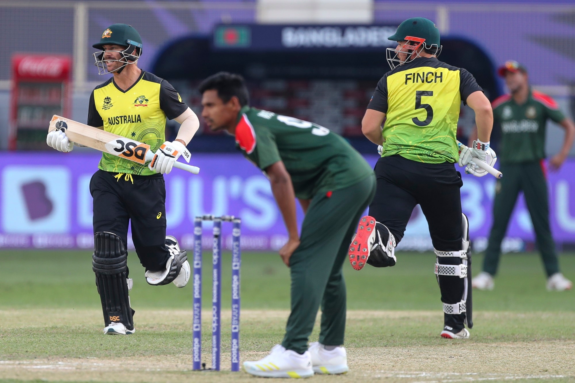ஏரோன் பிஞ்ச் 20 பந்துகளில் 2 பவுண்டரி 4 சிக்சர்கள் என்று 40 ரன்கள் எடுத்தும் வார்னர் 14 பந்துகளில் 3 பவுண்டரியுடன் 18 ரன்கள் என்றும் அடிக்கப் போய் பவுல்டு ஆகி வெளியேறினர். பவர் ப்ளே முடிவில் 6 ஓவர் 67/2. அடுத்து இறங்கிய மிட்செல் மார்ஷ், டஸ்கின் அகமதுவை அடுத்த ஓவரிலேயே மிட் ஆப் மேல் ஒரு பவுண்டரி அடித்தார், பிறகு ஷார்ட் பிட்ச் பந்தை மிட்விக்கெட் மேல் பெரிய சிக்ஸ் விளாசி 38 பந்துகளில் பினிஷ் செய்தது ஆஸ்திரேலியா. ஆட்ட நாயகன் ஆடம் ஜாம்ப்பா.