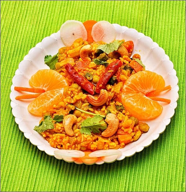 பிறகு கொத்தமல்லித்தழை, மிளகாய்த்தூள், கரம் மசாலாத்தூள், உப்பு சேர்த்து நன்கு வதக்கவும். அதனுடன் உருளைக்கிழங்கு, பச்சைப் பட்டாணி, வேகவைத்த அரிசி – பருப்பு கலவை சேர்த்து, சிறிதளவு தண்ணீர்விட்டு மூடி போட்டு, அடுப்பைச் சிறு தீயில் வைத்து ஐந்து நிமிடங்கள் கொதிக்கவிட்டு இறக்கவும். அலங்கரிக்கக் கொடுத்துள்ள பொருள்களை மேலே தூவி, சுட்ட அப்பளத்துடன் பரிமாறவும்.