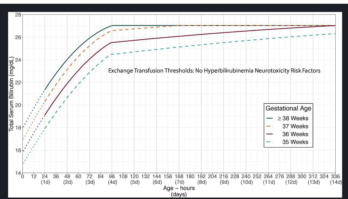 * பிலிருபினின் அளவு, ‘American Academy of Pediatrics (AAP)’-ன் ரத்த மாற்றம் வரைகட்டத்தில் நிர்ணயிக்கப்பட்டுள்ள பிலிருபின் அளவுகோலில் இருக்கும்போது.