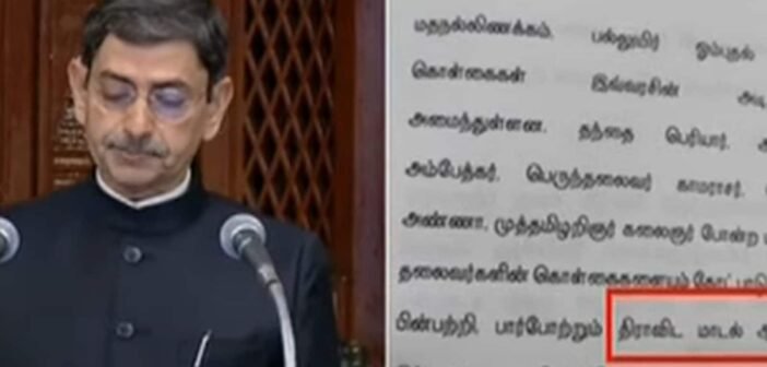 ஆளுநர் உரை தமிழாக்கத்தின் 47வது பக்கத்தில், “தந்தை பெரியார், அண்ணல் அம்பேத்கர், பெருந்தலைவர் காமராஜர், பேரறிஞர் அண்ணா, முத்தமிழ் அறிஞர் கலைஞர் போன்ற மாபெரும் தலைவர்களின் கொள்கைகளையும் கோட்பாடுகளையும் பின்பற்றி பார் போற்றும் திராவிட மாடல் ஆட்சியை இந்த அரசு வழங்கி வருகிறது” என்ற பத்தி இடம்பெற்றிருந்தது. ஆனால், அதனை தவிர்த்துவிட்டு மற்ற பத்திகளை வாசித்தார் ஆளுநர்.