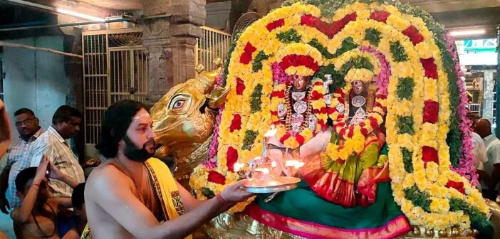 முன்னதாக நேற்று இரவு மகா சிவராத்திரியை முன்னிட்டு மூலவருக்கு நான்கு கால சிறப்பு அபிஷேக ஆராதனைகள் நடைபெற்றன. இதனைத் தொடர்ந்து ஆலய வளாகத்தில் அலங்கரிக்கப்பட்ட தங்க ரிஷப வாகனத்தில் ஸ்ரீ தர்ப்பாரண்யேஸ்வரர் மற்றும் ஸ்ரீ பிராணம்பிகை அம்பாள் எழுந்தருளி பக்தர்களுக்கு கோபுர தரிசனம் அளித்தார். மேலும் சுவாமிக்கு சிறப்பு தீபாராதனை செய்விக்கப்பட்டது.