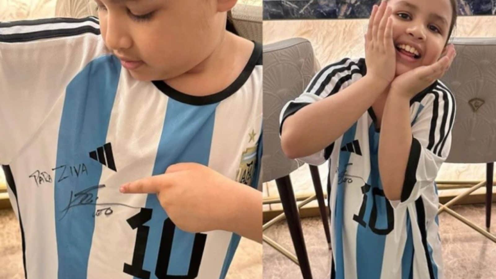 மெஸ்ஸி தனது கையொப்பமிட்ட அர்ஜென்டினா ஜெர்ஸியை தோனியின் மகள் ஸிவாவுக்கு அனுப்பியுள்ள புகைப்படத்தை தோனியின் மனைவி சாக்‌ஷி தனது இன்ஸ்டாகிராம் பக்கத்தில் பதிவிட்டுள்ளார்.