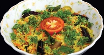 ஒரு டீஸ்பூன் சமையல் எண்ணெயைச் சூடுபண்ணிக் கொண்டு, வெங்காயம், கேரட் போட்டுக் கலந்து பாஸ்மதி சாத்துக்கு மேலே கார்னிஷ் செய்து, கொஞ்சம் கொத்தமல்லி இலைகளை அதன்மேல் சேர்க்க வேண்டும்.