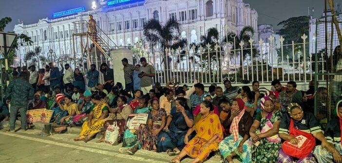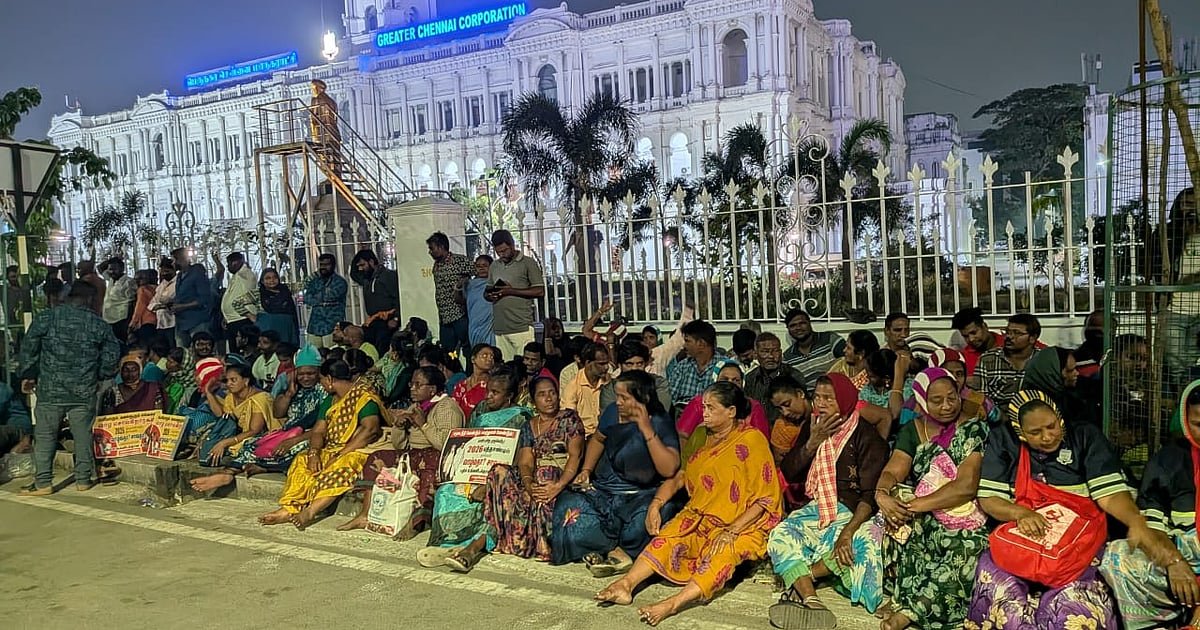 தனியார்மயமக்கலை எதிர்த்தும் பணி நிரந்தரம் வேண்டியும் தொடர் போராட்டங்களை முன்னெடுத்து வரும் தூய்மைப் பணியாளர்கள் மீண்டும் ரிப்பன் மாளிகைக்கு வெளியே அமர்ந்து போராட்டத்தை தொடங்கியிருக்கின்றனர்.