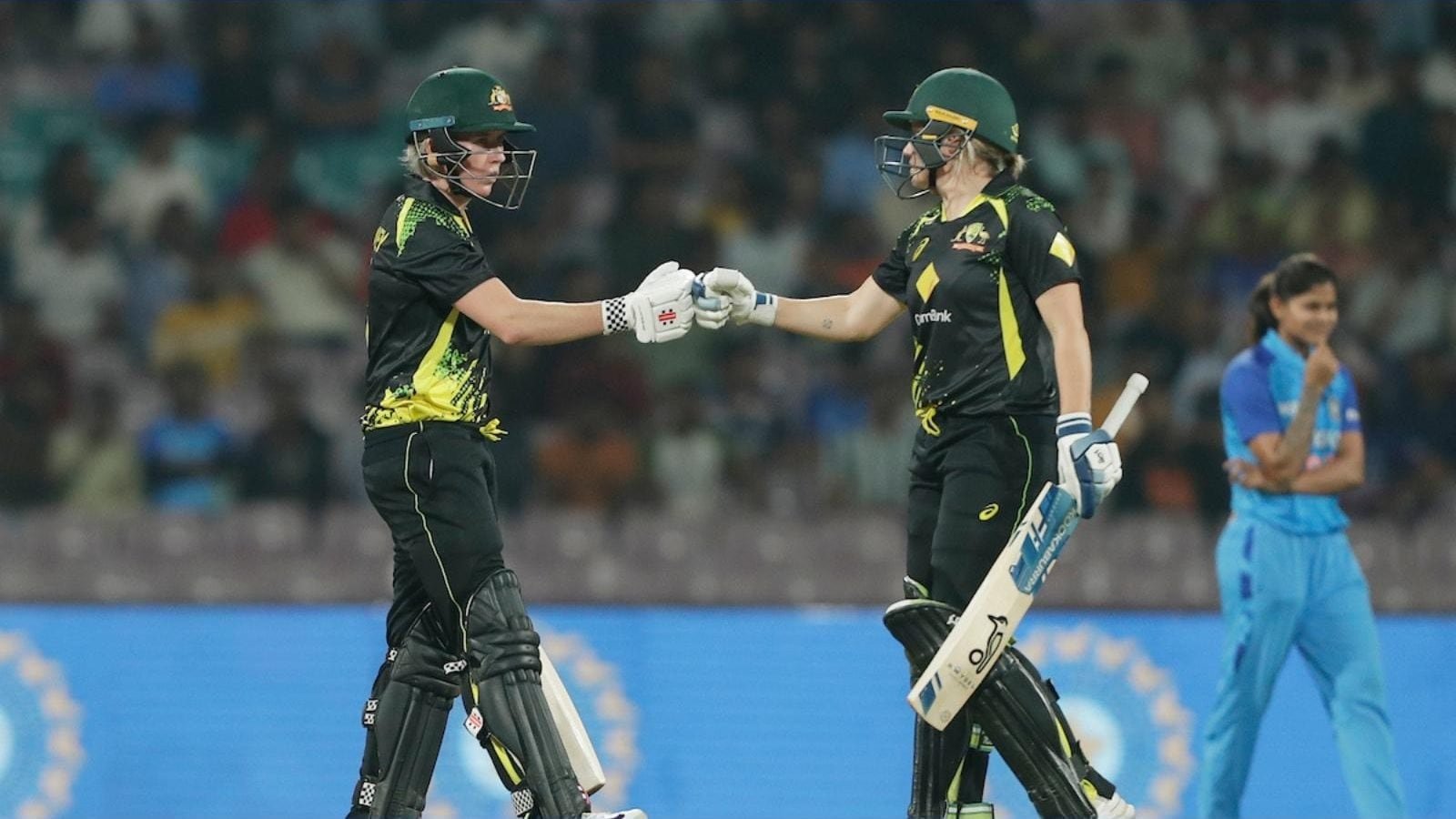 20 ஓவர்கள் முடிவில் இந்திய அணி 172 என்ற சவாலான ஸ்கோரை எடுத்தது. இதையடுத்து 173 ரன்கள் எடுத்தால் வெற்றி என்ற இலக்குடன் ஆஸ்திரேலிய மகளிர் கிரிக்கெட் அணி களத்தில் இறங்கியது. அதன் தொடக்க வீராங்கனைகளான பெத் மோனி மற்றும் கேப்டன் அலிசா ஹீலி ஆகியோர் நிதானமாக விளையாடி ரன்களை சேர்த்தனர். 2 சிக்ஸர் 4 பவுண்டரிகளுடன் 23 பந்துகளில் 37 ரன்களை எடுத்து கேப்டன் அலிசா ஹீலி ஆட்டமிழந்தார்.