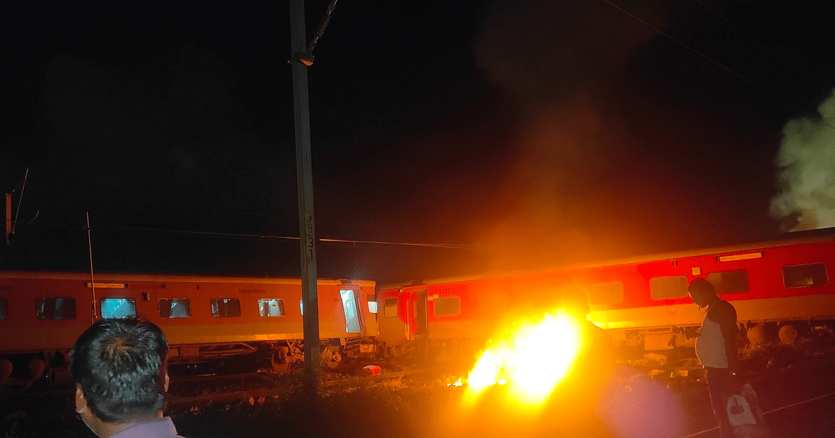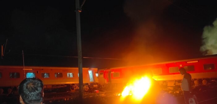 இந்த விபத்து நடந்த பகுதிக்கு மீட்புப் பணியினர் விரைந்து வருகின்றனர். பயணிகள் விரைவு ரயிலின் 2 பெட்டிகள் தீப்பிடித்து எரிவதால் பரபரப்பு ஏற்பட்டிருக்கிறது. பயணிகள் விரைவு ரயிலின் மேலும் சில பெட்டிகள் தடம் புரண்டுள்ளதாகவும் தகவல்