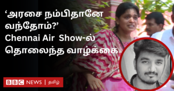 காணொளிக் குறிப்பு, சென்னை விமானப்படை சாகசத்தை பார்க்கவந்து பறிபோன உயிர்கள்சென்னை விமானப்படை சாகசத்தை பார்க்க வந்து பறிபோன உயிர்கள்; என்ன நடந்தது?7 அக்டோபர் 2024, 17:06 GMTபுதுப்பிக்கப்பட்டது 19 நிமிடங்களுக்கு முன்னர்மெரினா கடற்கரையில் இந்திய விமானப்படையினரின் சாகச நிகழ்ச்சி அக்டோபர் 6-ஆம் தேதி அன்று நடைபெற்றது. இந்த நிகழ்ச்சியை நேரில் காண பெரும் திரளான மக்கள் மெரினா கடற்கரையில் திரண்டிருந்தனர். இந்நிகழ்ச்சியைப் பார்க்கச் சென்று, உயிரிழந்த கார்த்திகேயனின் குடும்பம் நிலைகுலைந்து நிற்கிறது. மேலும் விவரங்கள் காணொளியில்… -…