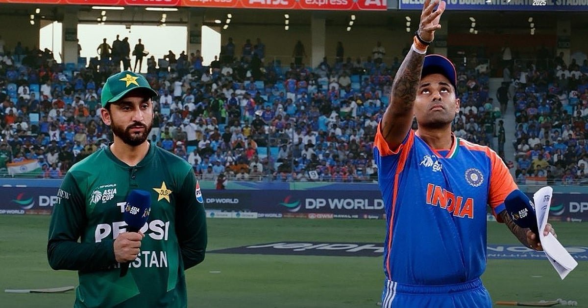 இந்திய அணியின் கேப்டன் சூர்யகுமார் யாதவ் மற்றும் பாகிஸ்தான் கேப்டன் சல்மான் அலி ஆகா இருவரும் தங்களது அணியினரின் பட்டியலை நடுவரிடம் கொடுத்துவிட்டு, வர்ணனையாளர் ரவி சாஸ்திரியிடம் பேசிவிட்டு உடை மாற்றும் அறைக்குச் சென்றுள்ளனர்.
