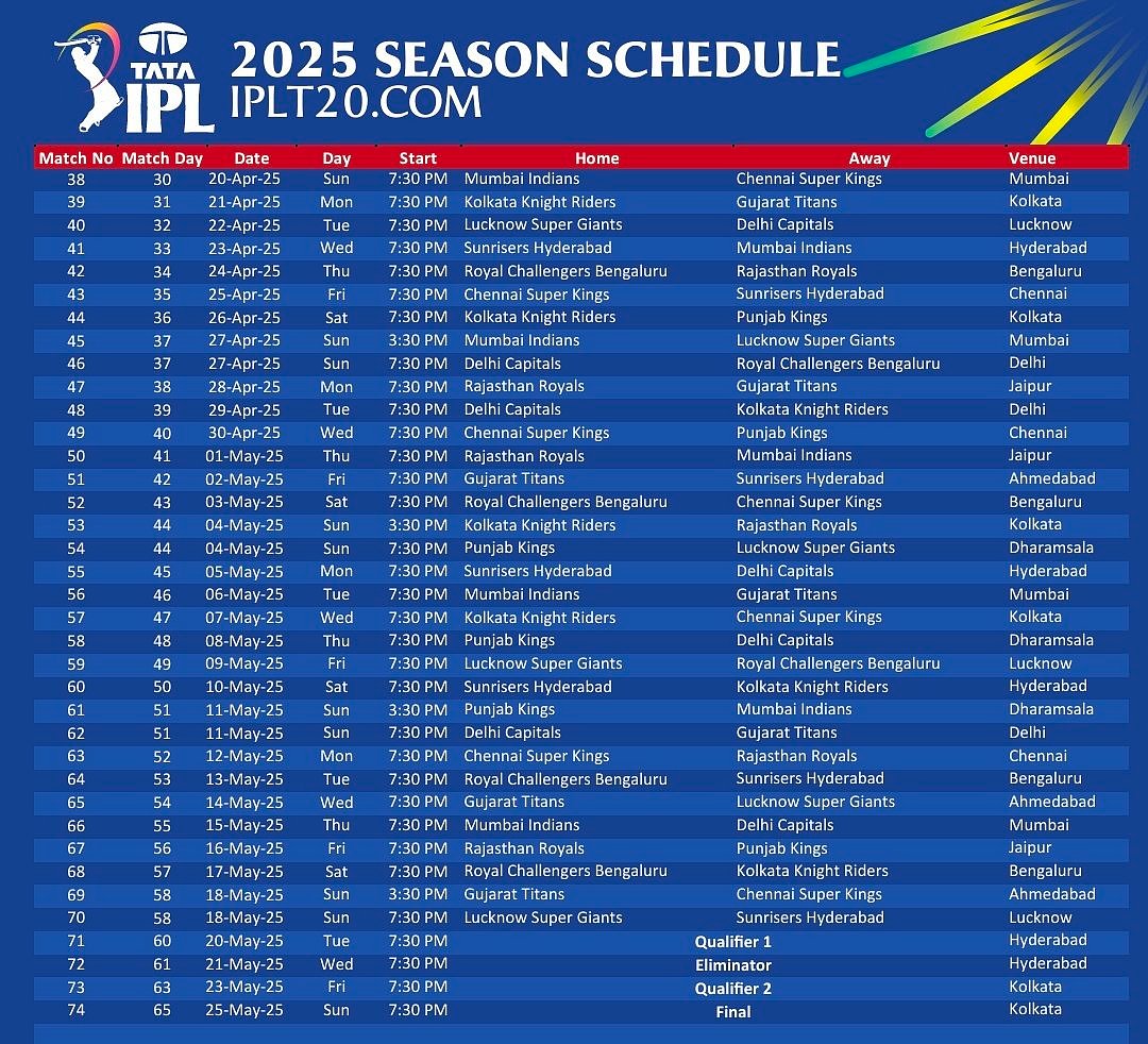 2025 ஆம் ஆண்டுக்கான ஐ.பி.எல் போட்டி அட்டவணையை பிசிசிஐ வெளியிட்டுள்ளது. அதன்படி, மார்ச் 22 ஆம் தேதி தொடங்கும் ஐ.பி.எல் இன் 18 வது சீசன் மே 25 ஆம் தேதி வரை நடைபெறவிருக்கிறது.
