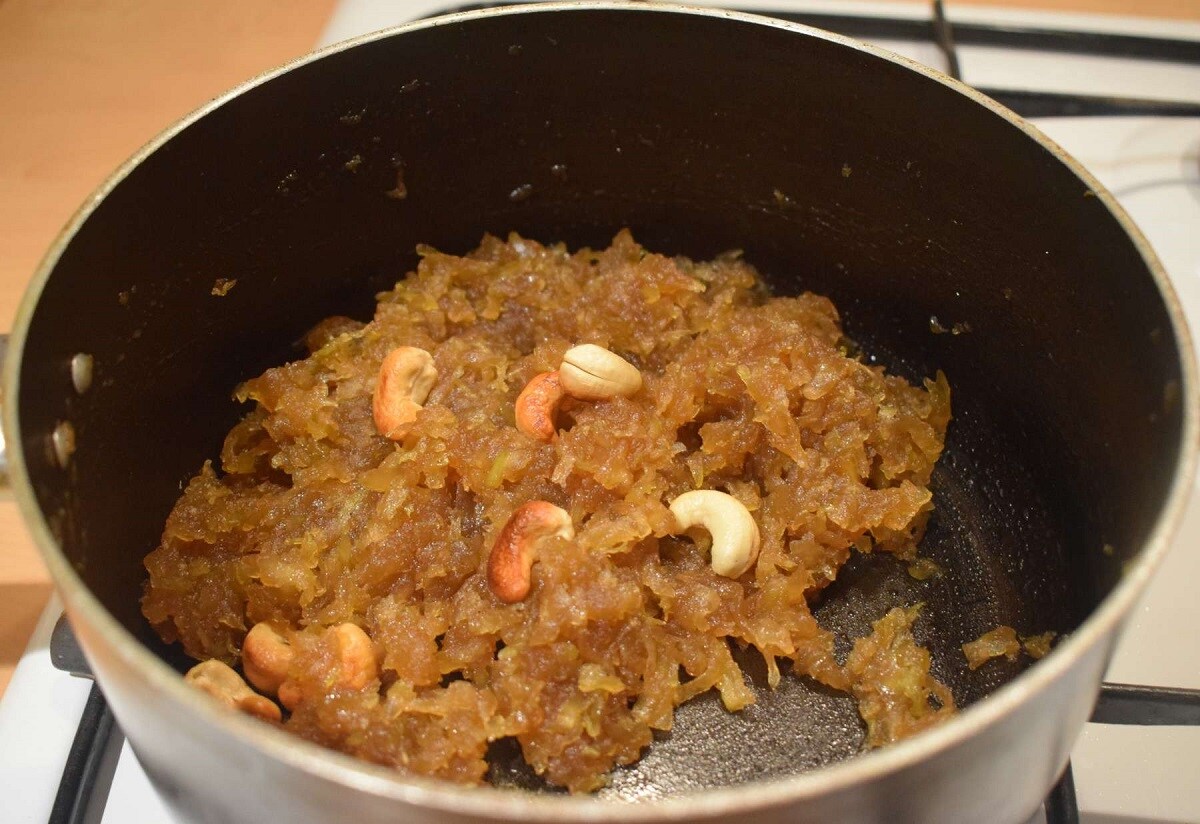 பின் நெய் சேர்த்து கைவிடாமல் நன்கு கிளறிக்கொண்டே இருக்க சுருங்கி அல்வா பதத்திற்கு வரும். இறுதியாக வறுத்த முந்திரியை தூவி அடுப்பை அணைத்துவிடுங்கள்.